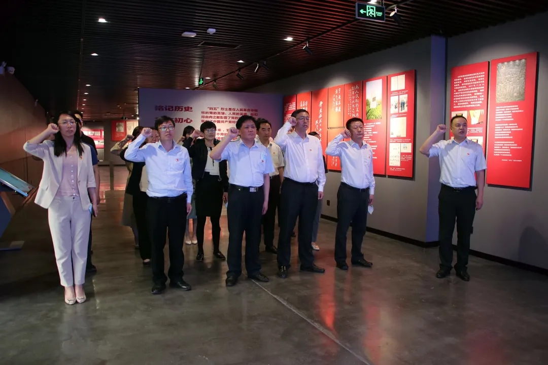 庄重的展厅中、详实的展板上,一个个感人故事、一幅幅历史影像再现了山东早期党组织发展与斗争的艰难历程,邓恩铭、刘谦初等22位共产党人为无产阶级革命义无反顾奋斗终身的理想信念,书写了“星星之火燎原齐鲁”的宏伟篇章。通过“四五”革命烈士英雄事迹的系统讲解,大家仿佛回到了那段血雨腥风的峥嵘岁月,被革命先烈坚持真理的无畏精神、战胜困难的拼搏精神、血战到底的胜利精神深深感动。最后,全体党员面对党旗,同举右手,重温入党誓词,表达了对党的坚定信念和真挚情感。