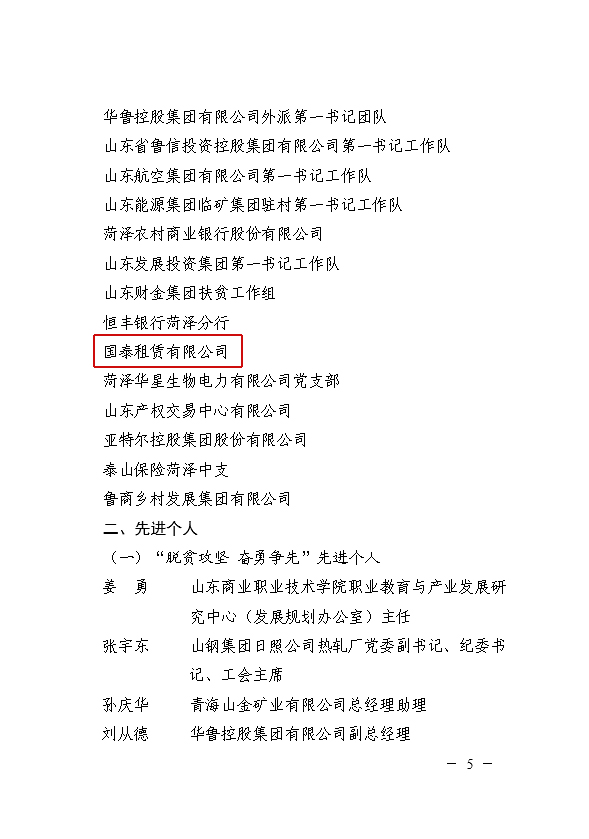 近日,省国资委、省发改委、省扶贫办联合发布通报,对省属企业脱贫攻坚、对口支援和东西部扶贫协作先进集体和先进个人进行通报表扬。山东国惠刘珂同志荣获“脱贫攻坚 奋勇争先”先进个人称号,山东国惠所属国泰租赁荣获“精准扶贫 攻坚克难”先进集体称号。