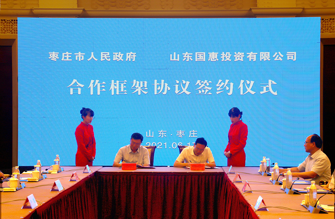 6月17日下午,山东国惠投资有限公司与枣庄市政府合作框架协议签约仪式在枣庄市开元凤鸣山庄举行。枣庄市委书记、市人大常委会主任陈平,公司党委书记、董事长尹鹏出席并致辞,枣庄市委副书记、市长张宏伟主持仪式。枣庄市委常委、秘书长朱国伟,副市长刘吉忠,市政府党组成员、秘书长孙永,山东国惠投资有限公司党委委员、副总经理姜国栋出席签约仪式。