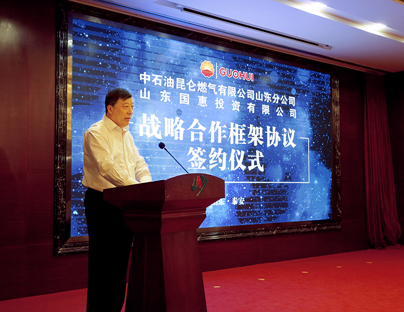 尹鹏董事长对泰安市委市政府一直以来的关心、支持和帮助表示衷心感谢,也对中国石油天然气销售山东分公司在合作洽谈中表现的诚意和给予的信任表示感谢。他简要介绍了山东国惠的基本情况,重点介绍利用泰安优势盐穴资源建设储气储能项目的概况和进展。他表示,项目建成后将弥补山东省内储气能力不足的短板,带来良好的社会效益和经济效益。本次战略合作协议的签署,一定会对双方的全面合作,产生积极而深远的影响。下一步将完善工作机制,共同构建全面战略合作关系和长效合作机制,推动产业转型升级,实现高质量跨越发展。