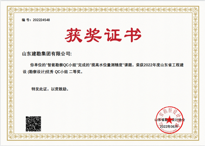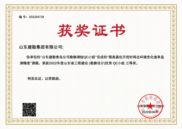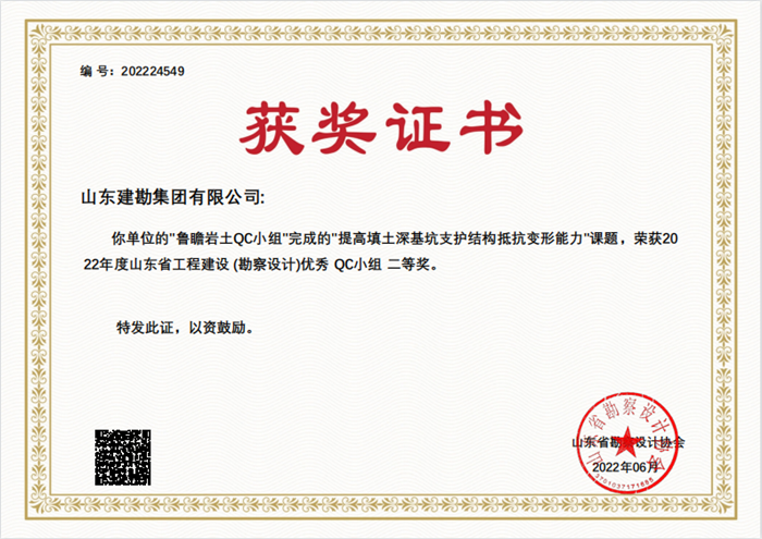 近日,由山东省勘察设计协会组织评选的2022年度山东省工程建设(勘察设计)优秀QC小组获奖名单揭晓。山东国惠直属企业山东建勘获得一等奖1项、二等奖2项、三等奖2项,其中“提高深厚填土下复杂岩溶场地桩勘施工效率”课题被省勘察协会推荐申报全国工程建设(勘察设计)优秀QC小组评选。